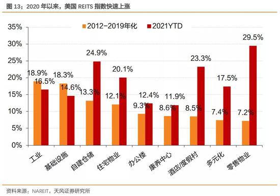 按照基础资产来看,工业、基础设施、自建仓储、住宅物业的REITS指数复合年化收益较高,从2012年到2019年底,分别达到了18.9%、18.3%、13.3%、12.1%。2020年,由于疫情影响,各类REITS指数普遍下跌,但2021年以来有明显反弹,截止2021年4月底,零售物业、自建仓储、酒店/度假村等REITS指数上涨幅度分别达到了29.5%、24.9%和23.3%。