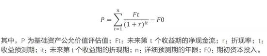 具体来说,首先计算出未来各年度的预期净现金流,然后将其用适当的折现率进行折现,最后加总未来各年度预期现金流现值,得出基础资产价值。其基本评估公式可以概括为:
