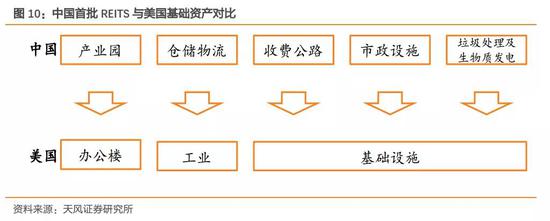 相比之下,国内首批REITS项目中的产业园类似于美国的办公楼REITS,仓储物流REITS似于美国的工业REITS,收费公路、市政设施、垃圾处理及生物质发电REITS类似于美国的基础设施REITS。