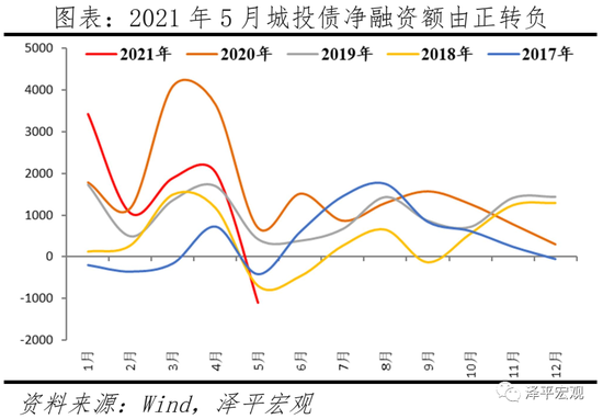 2021年一季度,城投债净融资规模为6343亿元,同比下降9.9%。4月城投债净融资规模为2022亿元,同比-44.7%。5月城投债净融资规模为-1093亿元,由正转负。