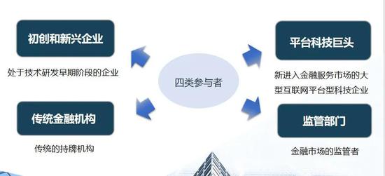 第一类参与者是初创企业,不管是在中国,还是在全球都有非常多的金融科技的初创企业,这些初创企业通常是为了解决金融体系运行中的特定的问题,致力于提供极致的技术解决方案。比如生物识别技术、人工智能技术等等。这一类初创企业非常多,而且演变非常快速。第二类参与者——平台科技巨头,这些平台公司的最早的商业起源并不是在金融领域,而是在社交、电商或者是移动设备的制造等领域。第三类参与者即传统的金融企业。第四类参与者,监管部门。