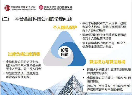近日,由中国财富管理50人论坛(CWM50)与清华大学五道口金融学院联合举办《平台金融科技公司监管研究》课题发布会。课题专家、招商银行首席经济学家丁安华对课题主报告作介绍时,分析了我国平台金融科技的演进路径及商业模式,认为轻资本、弱监管是平台企业主要发展取向,在此过程中容易形成垄断风险、信用风险与系统性风险,并衍生出特定伦理问题,建议创新金融科技监管方法,构建分级分类牌照体系;强化反垄断监管,改善公司治理;构建监管大数据平台;并进一步完善“监管沙盒”机制。