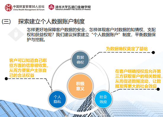 我们之所以希望推动平台科技企业为个人创立一个数据账户,主要是在实现数据确权基础上,挖掘数据的价值。也就是说,用户拥有这个账户的权利,有请求更正的权利,也有删除、复制和带走的权利,甚至包括授权个人数据账户开放给第三方的权利,而这个权利的关键在于用户本身,正所谓“我的数据我做主”。