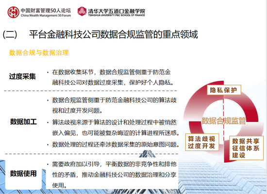 我们的报告反复强调,不但加强金融监管,更要完善数据治理。数据治理体现在数据生产的全流程之中。首先,在数据的采集过程之中,监管应该关心个人数据的安全和个人隐私的保护。其次,一旦数据采集进入到平台企业内部,监管应该关注这些数据如何被算法来控制、使用和加工,是否存在一些算法的歧视问题。我们需要对于算法有一定的理解。最后,数据的使用环节,在于如何挖掘数据的价值,使得数据服务于社会治理的公共目的。