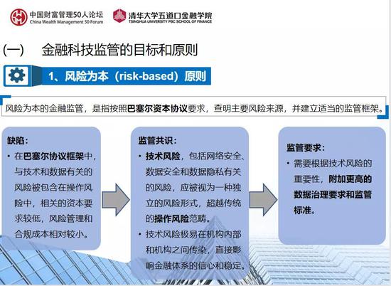一是风险为本。主要体现在《巴塞尔协议》之上。《巴塞尔协议》的逻辑很简单,首先识别风险的来源,然后形成监管的架构,最后附加资本的要求。在《巴塞尔协议》框架里面,技术风险归类在操作风险之中,或者称之为运营风险。现在国际上有种观点认为技术风险已经不能够简单地归类在操作风险里面,而是要单独成为一个风险的种类。《巴塞尔协议》本身是一个不断演进的框架,这套逻辑十分有效并且得到了全球公认。