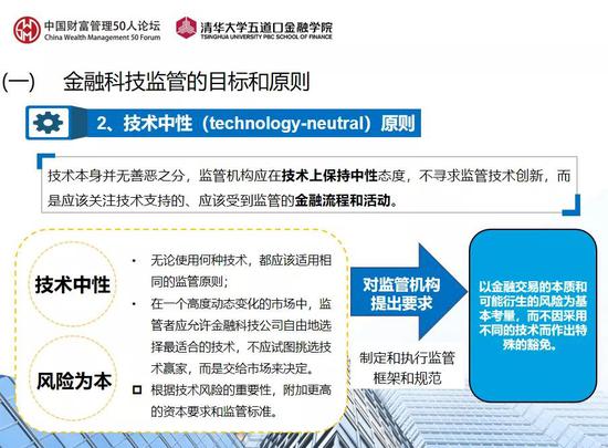 二是技术中性。技术本身没有什么善恶。因此我们针对技术问题应该持有中立或者中性的态度。这就告诉我们,不能因为某种技术的使用,而对一项金融服务的监管给与特定的豁免或附加特定的要求。