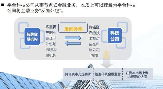 通常,每间传统金融机构都有很多的技术服务商,他们把特定技术服务外包给技术服务商,这可以理解为正向外包。而如今,平台金融科技的发展形成了一种反向外包。平台的做法是把轻资产的业务环节或节点留给自己,而把重资产的业务外包给合作的金融机构。具体的做法,就是平台拥有客户和对客户需求的认知,而将涉及资金的环节外包给金融机构。