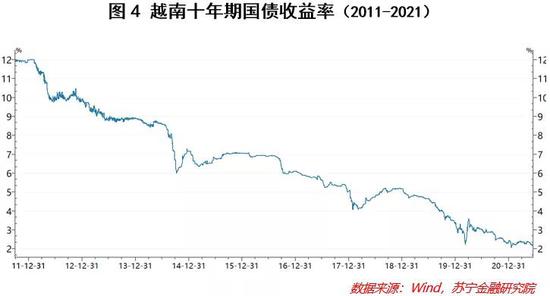 首先看利率,越南货币政策近年来一直保持比较宽松的状态。为了有效应对疫情带来的冲击,利率从疫情前的6%左右大幅调低至4%,为过去20年最低的利率水平。代表其国内资产定价的“锚”,十年期国债收益同样大幅走低,由此也推高了市场对于权益类资产的偏好。