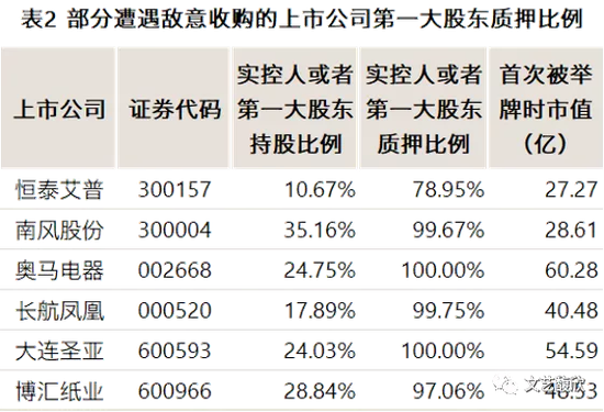 即使现任实控人持股比例较高,但由于本身债务高企,持有上市公司股份被高比例质押,当面对敌意收购时,不但无力进行针对性的增持,还可能因为失去上市公司的控制权,直接触发债务危机。