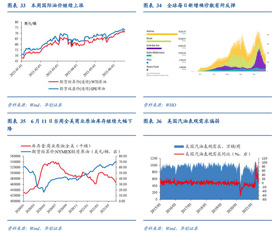 本周国际油价冲高回落,小幅收涨,已连涨四周。伊朗供给压力缓释、库存继续去化推动油价继续上涨,但印度变种毒株持续在全球大范围扩散以及美联储议息会议后美元走强也拖累了油价走势。截至6月18日,布油结算价收于73.22美元/桶,上涨0.83%;WTI原油期货结算价收于71.64美元/桶,上涨1.03%。