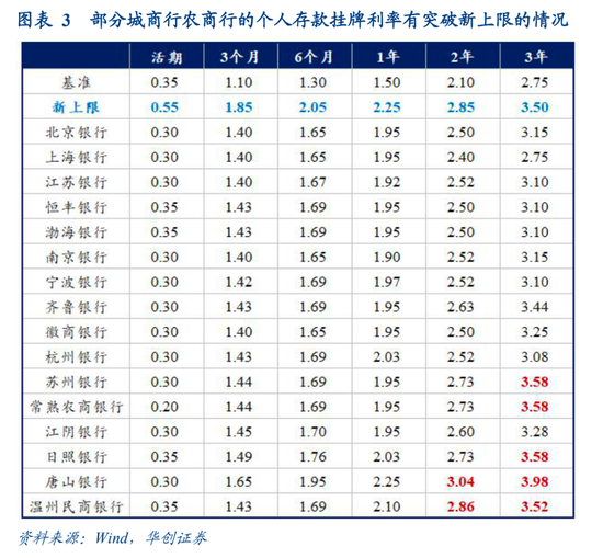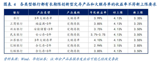 假如存款利率定价方式转变为“基准利率+基点”,哪部分存款受影响较大?以挂牌利率定价的定期存款,四大行和股份行均不受影响,部分中小银行长期定存挂牌利率可能需要小幅调降,比如日照银行3年个人定存挂牌利率为3.575%,温州民商银行3年定存挂牌利率3.52%,均小幅超出了新上限3.5%。差异化定价的各类创新型定存产品和大额存单,则无论是大行小行,都有一批长期限品种需要下调利率。这里我们在图3中列举了部分例子。