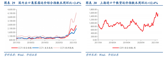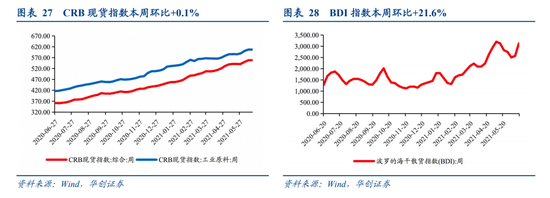 本周CRB现货指数环比+0.1%,工业原料价格指数环比-0.05%,大宗商品价格本周大致持平;BDI指数环比+21.6%,本周显著回升;国内出口集装箱运价指数继续创新高,综合指数环比+3.4%,其中美东航线、欧洲航线指数环比+7.9%、+4.3%;上海进口干散货运价指数环比+12.4%,本周大幅提升。