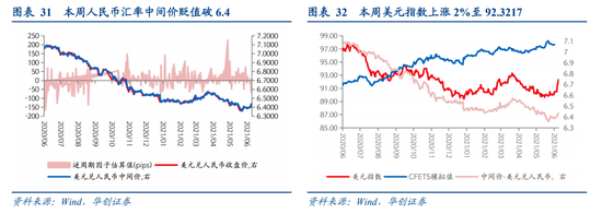 本周美元指数上涨2%至92.3217,人民币汇率中间价贬值破6.4。本周美联储FOMC会议决议立场偏鹰,点阵图大幅前移显示2023年将加息,同时发布会中鲍威尔对taper的表态也更为明朗,间接暗示Taper或已不远。FOMC会议后美元指数大幅反弹,并带来人民币汇率贬值跌破6.4。