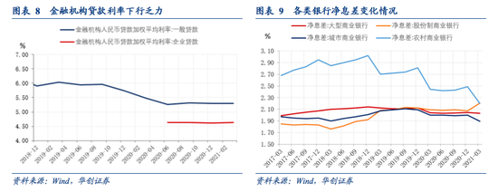 最重要的是,商业银行净息差收窄的压力已经阻碍了贷款利率的进一步下行,负债成本压力的缓和有利于银行进一步让利实体。2021年一季度,金融机构一般贷款加权平均利率僵持在5.3%,企业贷款加权平均利率还小幅抬升了2bp至4.63%。在这背后,一季度商业银行净息差继续压降至2.07%,中小行压力尤大,城商行和农商行净息差已达历史低位。我们认为,净息差继续压降的原因,一是2021年部分按揭贷款开始重定价利率有小幅下调,二是信贷结构的持续调整增加了银行资产端的压力(比如房地产贷款集中度要求、经营贷流向调查)。
