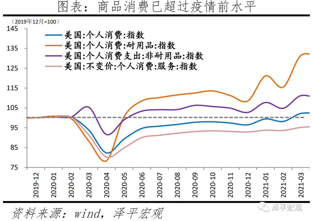 需求端加快恢复,在美国强刺激政策下,居民和企业的经济活动持续改善。美国制造业PMI新订单指数自2020年7月以来持续处于60%以上的高景气区间。个人消费支出和私人投资总额均已超过疫情前水平,一季度美国私人消费对经济拉动率为7.0%。具体来看,商品消费已超过疫情前水平,服务消费处于持续修复阶段;私人投资中,住宅和设备投资恢复领先整体投资。