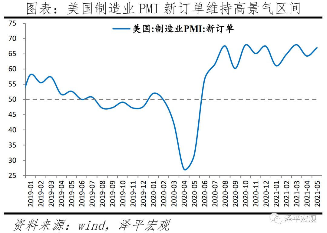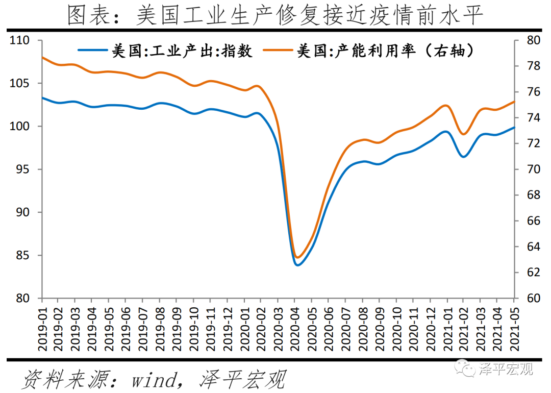 供给端,美国产能利用率、工业产出指数已恢复接近至疫情前水平。2021年5月美国工业产能利用率75.2%,2019年同期77.6%。美国制造业PMI产出指数自2020年7月以来基本处于60%以上高景气区间。