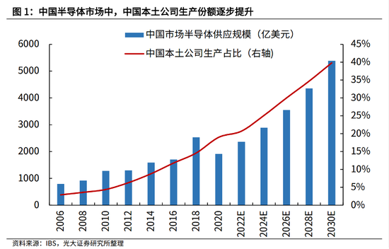 在前期政策和产业基金的大力支持下,半导体领域的国产替代已初见成效。据IBS统计,2014年中国市场的半导体供应量约有8.8%来自中国本土企业,2020年这一比例提升到19%,IBS预计到2030年,中国本土企业自主化率将提升至40%。
