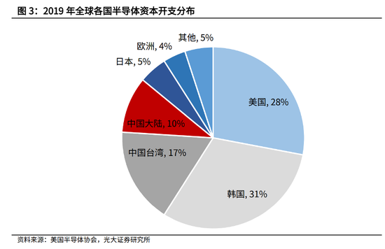 一是,国内半导体企业资本开支加速扩张。2018年,中国大陆半导体企业资本开支达到110亿美元,为2015年的5倍,并且超过当年日本和欧洲的半导体公司的总资本支出,占全球份额的10%。据美国半导体协会统计,2019年,中国大陆半导体企业资本开支在全球份额维持在10%,而欧洲、日本仅占比4%、5%。