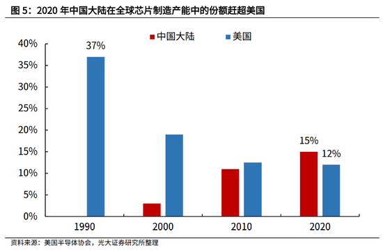 二是,国内半导体产业结构持续优化,芯片制造产能已赶超美国。2020年,国内芯片设计、晶圆制造的市场份额分别为39%、29%,较2015年分别上升2、4个百分点,对应IC设计、制造和封测的比例为4:3:3。在全球范围内,半导体业成熟、发达地区的比率为3:4:3,中国大陆正在逐步接近该比率。其中,在芯片制造领域,美国芯片制造产能占全球的份额从1990年的37%下降至2020年的12%,同期中国大陆的市场份额从几乎为零扩大到15%。