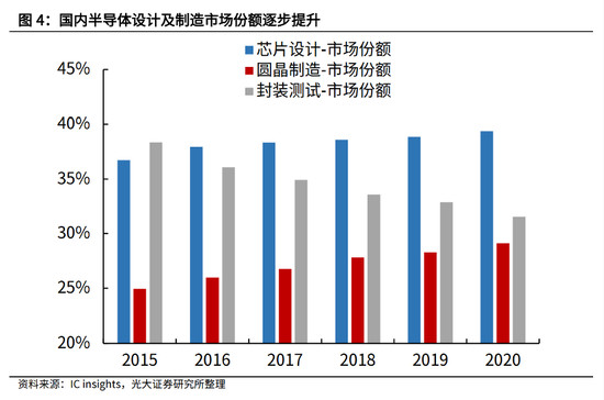 三是,国内企业加速布局半导体全产业链。例如,在设计领域,已经出现华为海思等具有国际竞争力的企业;在制造领域,中芯国际、华虹正在积极扩产。据IC Insights预计,2020年中国市场纯晶圆代工销售占比达22%,较2010年增加17个百分点;在设备领域,北方华创、中微半导体、芯源微、华峰测控等厂商皆已打入本土供应链;在材料领域,晶瑞股份,沪硅产业、雅克科技等公司也在陆续开展项目。