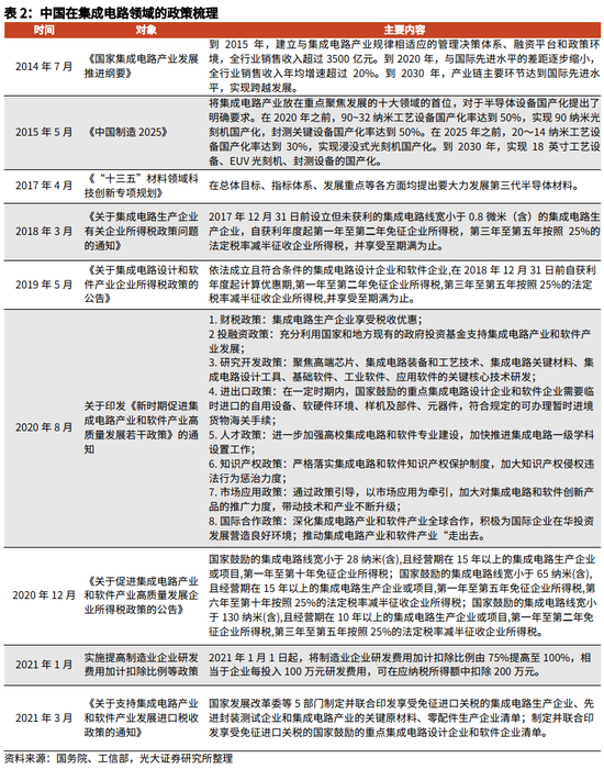 早在2014年,国务院发布《国家集成电路产业发展推进纲要》,强调到2030年,产业链主要环节达到国际先进水平,实现跨越发展。具体提出设立国家产业投资基金、加大金融和税收支持、强化企业创新能力、加大人才引进、扩大对外开放等,重点解决国内存在集成电路产品大量依赖进口、芯片制造企业融资难、持续创新能力不足、产业发展与市场需求脱节等问题。