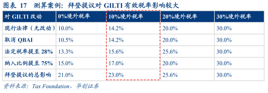 由于境外企业所得税的抵免比例限制为80%,理论上当境外税率高于10.5%/80%=13.125%时,跨国公司就无需再向美国缴纳GILTI税额,因此13.125%是大多数美国跨国公司的GILTI有效税率上限;若境外税率为0%,则GILTI有效税率等于法定税率(10.5%)。