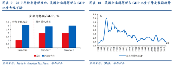 税收不高,首先体现在美国企业所得税占GDP和财政收入的比重不高、且长期下降:2016年(特朗普税改前)美国企业所得税占GDP的比重为1.9%,低于OECD平均(2.9%),2019年(特朗普税改后)该比重进一步降低至1.0%,拜登计划将该比重恢复到约2%的特朗普税改前水平。拉长来看,美国企业所得税占GDP的比重呈长期下降:二战结束时该数字一度高达7.1%,而金融危机前的高点仅为2.6%。