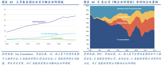 二是大多数美国企业实际上不缴企业所得税,且这部分企业的数量和净利润占比不断增加。1980年代里根降税以来,美国个税税率的大幅降低使大量企业主选择合伙、个人独资、有限责任公司以及S类股份有限公司等不缴企业所得税的公司形式,导致缴纳企业所得税的C类股份有限公司数量占比已不足20%、净利润占比已不到一半。