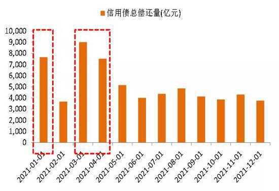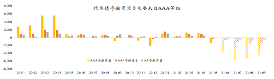 根据按月统计的总规模的数据可知,2021净融资总规模与前几年整体一致,4—5月份差别明显。整个信用债的净融资为负主要来自于AAA等级,从2020年1月至今,AAA评级的净融资额波动下降。