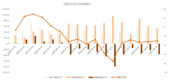 第四,民企身影在信用市场逐渐淡出。市场波动加剧,资金避险情绪明显影响下,民营企业发行融资规模2021年以来整体呈现下降趋势;净融资额持续为负且有扩大的趋势,2021年以来净融资规模-1432.23亿元,较去年同期净融资662.19亿元同比降幅较大。