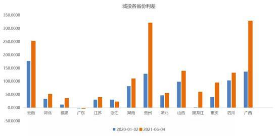 第七,城投行业内区域间利差分化加剧。近两年,尤其在去年个别大主体违约之后,这种情况变得尤为突出。广西、贵州、云南等省份的利差大幅上行,几乎被市场抛弃。长三角和大湾区的中部和南部等发行主体比较受市场欢迎。