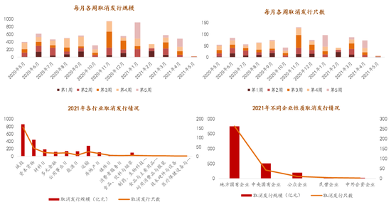 第五,一级频繁取消发行,国企、城投占比高。2020年11月至2021年6月15日,市场累计510支信用债取消发行,涉及金额3927.28亿元;2021年取消发行的债券中地方国企和城投行业占比最高,5月受审核端趋严整体发行规模大幅下降,取消发行规模随之下降。