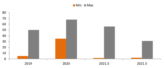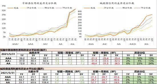 第四,投资者扎堆聚集,叠加一级供给减少,造成二级市场哄抢。2021年信用利差Min创下新低,变相印证了市场当前的分层情绪;2021年3—5月期间,底线利差值仍在底部,高等级、短久期仍不断被市场挖掘;上限值略有下降,但分层现象仍在,优质资产配置价值逐渐下降,市场已经开始在二级市场哄抢高性价比债项投资。