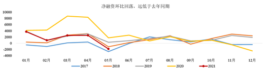 第一,全市场口径下,今年以来市场净融资同比大幅收缩。市场净融资2021年初有所恢复,但仍远低于去年同期,且最近几个月持续下降,5月净融资完全转负,AAA评级转负的程度最大。