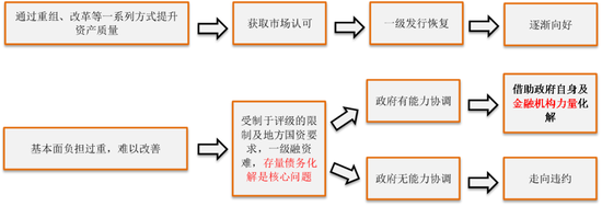 由此可见,如何改造和重组弱主体,的确考验地方政府智慧。 对于弱资质的国企,市场至少认为有两个可能性:能够通过重组改革真正提升资产质量,就能获得市场认可,恢复一级发行,逐渐恢复正常市场运行。但是如果基本面负担过重,持续难以改善,受制于评级限制,这种分化为两种:政府如果有能力协调,借助政府自身以及本土金融机构的力量来化解的或能延续。如果无能力协调的,就会出现违约的情形。今年市场预期,违约情况有较大的发生概率。