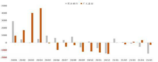 2021年3—5月,商业银行均在减持,广义基金在5月份减持。