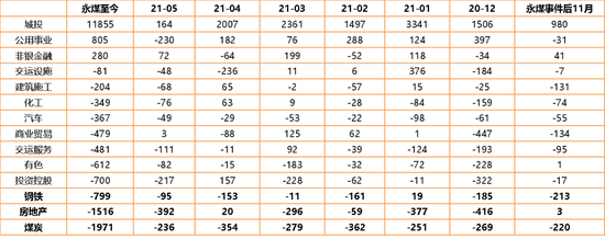 第二,净融资行业分层明显,地产、煤炭、钢铁等主流行业净融资多数月份持续为负。2021年以来城投行业净融资持续为正,但净融资规模有所下降,5月净融资规模大幅下降,仅有164亿元;受调控和环保减碳压力下,地产、钢铁和煤炭等净融资规模多月持续为负。