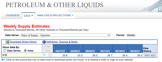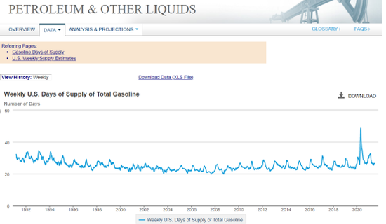 通过查阅EIA数据,我们可以发现,上一周美国的汽油库存的可用天数已经逐步上升至26.5天的水平,这意味着,相比较于美国WTI原油的供给紧缺局面,美国市场上的汽油供应形势并不紧张了,甚至我们可以说美国汽油已经开始有点过剩的迹象了。大家要知道,与囤积原油相比,炼油厂绝不会喜欢囤积大量多余的成品油,因为成品油的挥发性特点,很难长期安全的存储,尤其是美国的汽油是分为夏季规格和冬季规格的,所以尽管WTI原油价格猛涨,但是RBOB汽油价格绝不会同比例的猛涨。