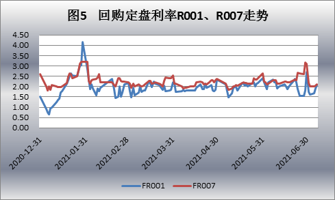 从上半年资金市场价格走势看,除1月份波动较大外,银行间债券回购定盘利率R001和R007保持总体平稳运行态势。R001由2020年末的1.5%升至1月末的4.15%高位后逐渐平缓,围绕在1.97%左右微幅振荡;R007由2020年末的2.6%摸高至1月末的3.19%后,围绕在2.25%左右微幅振荡;进入7月份以来,R001和R007均有明显下降,分别由6月末的2.7%、3.1%降至2.08%和2.12%,降幅分别达62BP和103BP。这显然与近期房贷利率上行态势形成明显反差(见图5)。