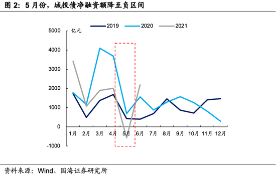 第二阶段:严控债券。2020年4季度以来,交易所、发改委、交易商协会等部门,陆续出台新的针对城投融资的监管标准,比如交易所“红橙黄绿”等。这个过程中,监管导向体现为严控城投各类“新增项目债券”,而这也是今年5月,城投债净融资降至负值区间的重要原因。
