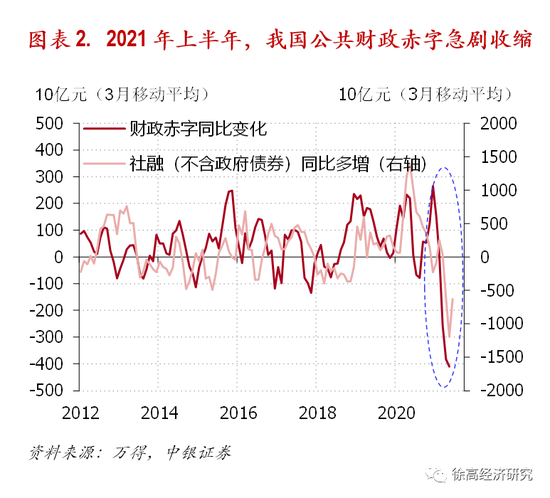 财政赤字是衡量财政政策宽松与否的重要指标。一般而言,财政赤字越大,财政政策越宽松,财政对经济增长的支持作用越强。反过来,财政赤字的收缩则意味着财政政策收紧。今年上半年,我国财政赤字明显收缩,财政对经济增长的支持作用明显减弱。2021年1到5月,我国公共财政实现盈余约3千亿元,相比2020年前5月1.26万亿元的公共财政赤字,今年前5个月我国公共财政赤字少了1.55万亿元。(图表 2)