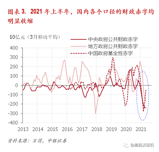 政府基金收支的情况也类似:一方面是包括土地出让金在内的各项收入的快速增长,另一方面是政府基金较慢的支出增速——政府基金性收支对经济增长的拉动力也明显减弱。这样一来,今年上半年我国各口径财政赤字均显著收缩——中央公共财政赤字、地方公共财政赤字、政府基金收支赤字均明显减小——财政政策支持经济增长的力度明显降低。(图表 3)