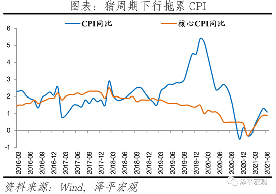 6月底猪肉价格呈现阶段性反弹的特征,但供需基本面尚未出现根本性转变,猪肉价格不具备大幅上涨的基础。6月底生猪现货和期货价格均涨超15%,结束此前连续5个月下跌;猪粮比4.47进入一级预警。本轮猪周期始于2018年中,持续上行至2019年底,开始高位震荡,2021年初加速下跌。产能方面,生猪存栏量与能繁母猪存栏量均于2019年10月见底后持续增长,2021年初能繁母猪存栏环比放缓,但供大于求的格局并未转变。此前我们提出拿掉猪以后都是通胀,猪肉价格周期下行对CPI的上涨起到一定平抑作用。