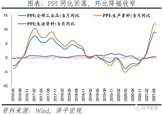 国内PPI对CPI的传导正在显现,但是受终端需求温和复苏影响、叠加此前猪肉价格周期下行,PPI向CPI传导整体并不畅通,但拿掉猪以后都是通胀。6月国内PPI同比8.8%,CPI同比1.1%,PPI同比和CPI同比都较上月回落0.2%,PPI-CPI剪刀差前期走扩后当前仍维持较高水位。从分项看,CPI食品和非食品项分化仍存在,6月CPI非食品价格同比1.7%,而食品项同比负1.7%,食品项环比连续4个月下滑;6月PPI生活资料价格涨幅环比下滑0.2%,同比涨幅0.3%,远不及生产资料涨幅。