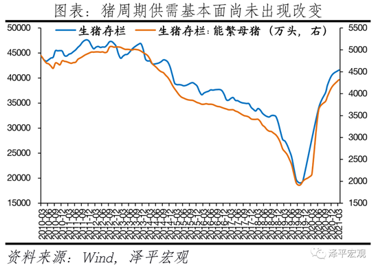 本轮猪周期始于2018年中,2020年猪价开始震荡下跌。本轮猪肉价格受到非洲猪瘟、环保限产政策、猪周期内生上涨动能、规模化养殖等多重因素影响,显现猪肉价格涨幅大、速度快等特点。全国猪肉均批发价在2019年11月超过50元/千克高点,随后震荡下行。随着生猪产能加速恢复,猪周期进入下行阶段。生猪存栏量与能繁母猪存栏量均于2019年10月见底,此后持续增长,产能逐步提升。随着猪粮比低于5进入一级预警区间,后续需密切关注猪肉价格低位边际反弹对CPI的影响。