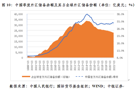 所谓“美元陷阱”,是指当储备货币超发时,外汇储备既是国际货币体系不稳定的来源,也会成为外汇储备持有者的负担,使其陷入两难困境,即:不抛售储备资产,有可能面临储备资产缩水的风险;抛售储备资产,又可能加快储备资产缩水,减少储备资产积累,还会加速本币汇率升值。2008年金融危机爆发后,中国以增加外汇储备的方式阻止人民币过快升值,2009年初至2010年底,中国新增外汇储备9013亿美元。而这次危机,中国央行基本退出外汇常态干预,在无限量宽实施一年来,中国仅新增外汇储备1094亿美元。截至今年第一季度末,中国外汇储备占全球外汇储备(含未披露币种构成的外汇储备)份额为25.2%,较2014年第一季度末峰值低了8.1个百分点(见图10)。