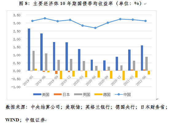 2008年金融危机以来,主要经济体普遍实施非常规货币政策。去年应对全球公共卫生危机,货币刺激进一步加码,全球零收益、负收益债券盛行,全球安全资产稀缺。而中国始终珍惜正常货币政策空间,保持了人民币资产的正收益(见图8)。加之近年来中国债券市场对外开放的体制机制安排不断与国际接轨,人民币债券先后被纳入三大国际债券指数,这增加了人民币债券资产的国际吸引力。