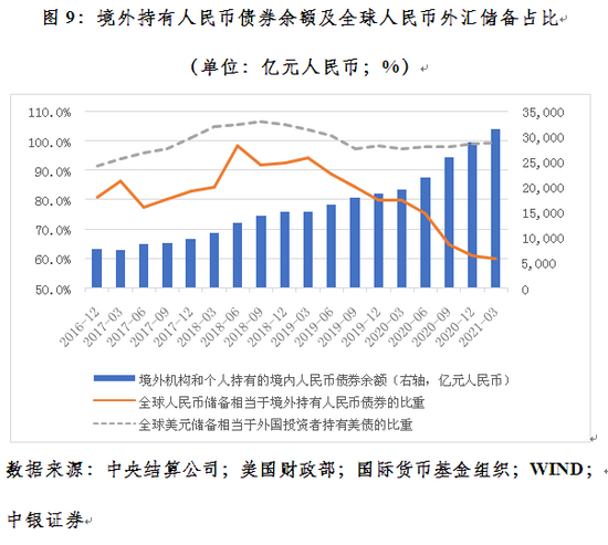 作为新兴国际储备货币,全球人民币储备主要是投资高信用等级的境内人民币债券。根据中央结算公司统计,截至今年第一季度末,境外机构和个人持有境内人民币债券资产余额3.16万亿元,全球人民币储备相当于境外持有人民币债券余额的59.8%。自2016年底首次披露全球人民币外汇储备以来,该项占比最高为2019年第一季度末的94.3%(见图9)。人民币储备相当于境外投资者持有境内人民币债券的占比下降说明,现在高信用等级的境内人民币债券既受到境外官方机构的青睐,也是境外商业机构的新宠,是境外资产多元化配置的重要底层资产。当然,这也意味着,现在要慎用境外投资者持有境内人民币债券来研判全球人民币储备持有变化,因为这可能是境外商业机构持有变动所引起的。