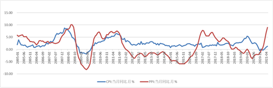 当然,如果价格的变化并非由总供给和总需求关系变化引起,PPI到CPI的传导关系就不直接,比如2016年、2017年去产能、去库存造成上游供给减少、推动PPI上涨,并非总需求旺盛,因而CPI相对稳定;2019年猪肉价格推动CPI上涨,也并非总需求旺盛,因而不影响PPI的下行,除了这两个特殊阶段的相关性不明显之外,20多年来大部分年份PPI和CPI走势亦步亦趋,因而如果本轮PPI持续上涨,其向CPI传导的压力还是很大的。