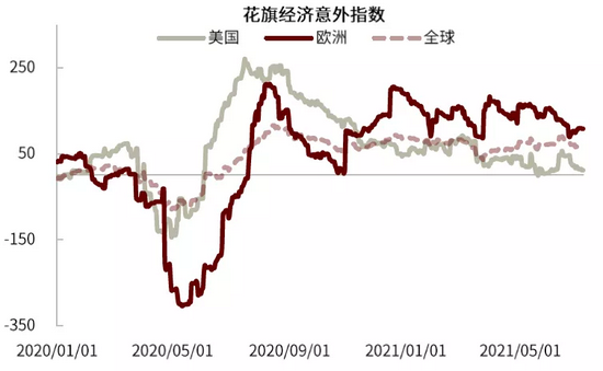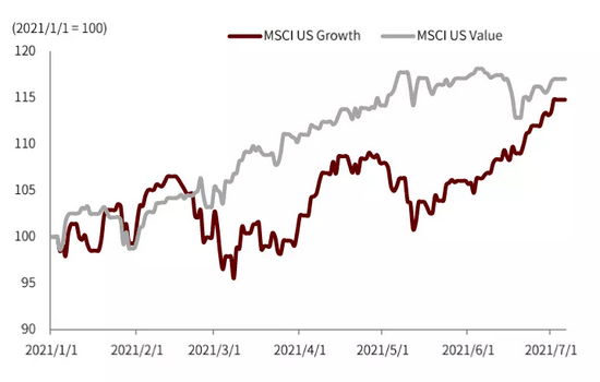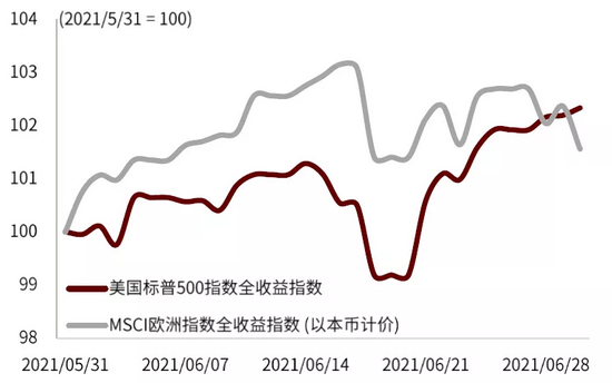 其次,目前“再通胀交易”渐显颓势,可能加大海外风险资产(尤其是美国股市)对政策变化的敏感程度。我们认为今年美国股市走势大体由两个相反的力量角力决定:疫情好转、经济复苏形成推力,政策退出预期形成压力。在风险资产内部可以大体分为周期与成长风格,其中周期风格对经济复苏推力更敏感,成长风格对政策压力更敏感。进入6月份,“再通胀交易”渐露颓势(详见《海外资产配置月报(2021-7):再通胀交易的回落》),可能说明周期风格已经比较充分地反映经济复苏预期,经济复苏推力的影响边际减弱。虽然目前美股仍在上涨,但上涨动力已经切换为成长风格,导致市场整体对政策退出压力更敏感。“再通胀”交易退潮之后,若未来流动性预期开始收紧,美国股市可能面临更大调整风险。与美国对比,我们认为欧洲的经济基本面与资产价格修复空间更大,同时政策更为宽松,可能是更好的海外风险资产投资标的。因此,我们维持逐步减配美国资产,超配欧洲资产的判断。
